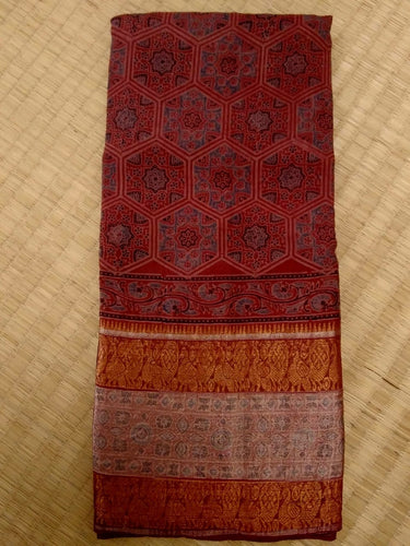 Kanchi Border Reddish Maroon - Ajrakh Hand Block Printed Mangalgiri Pure Silk Cotton Saree