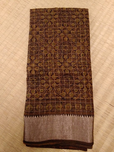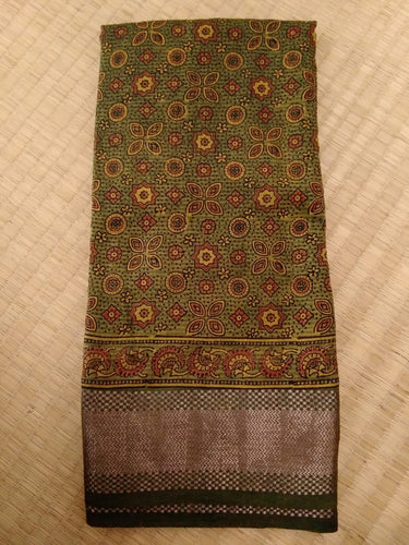 Temple Border Greenish Black - Ajrakh Hand Block Printed Mangalgiri Pure Silk Cotton Saree