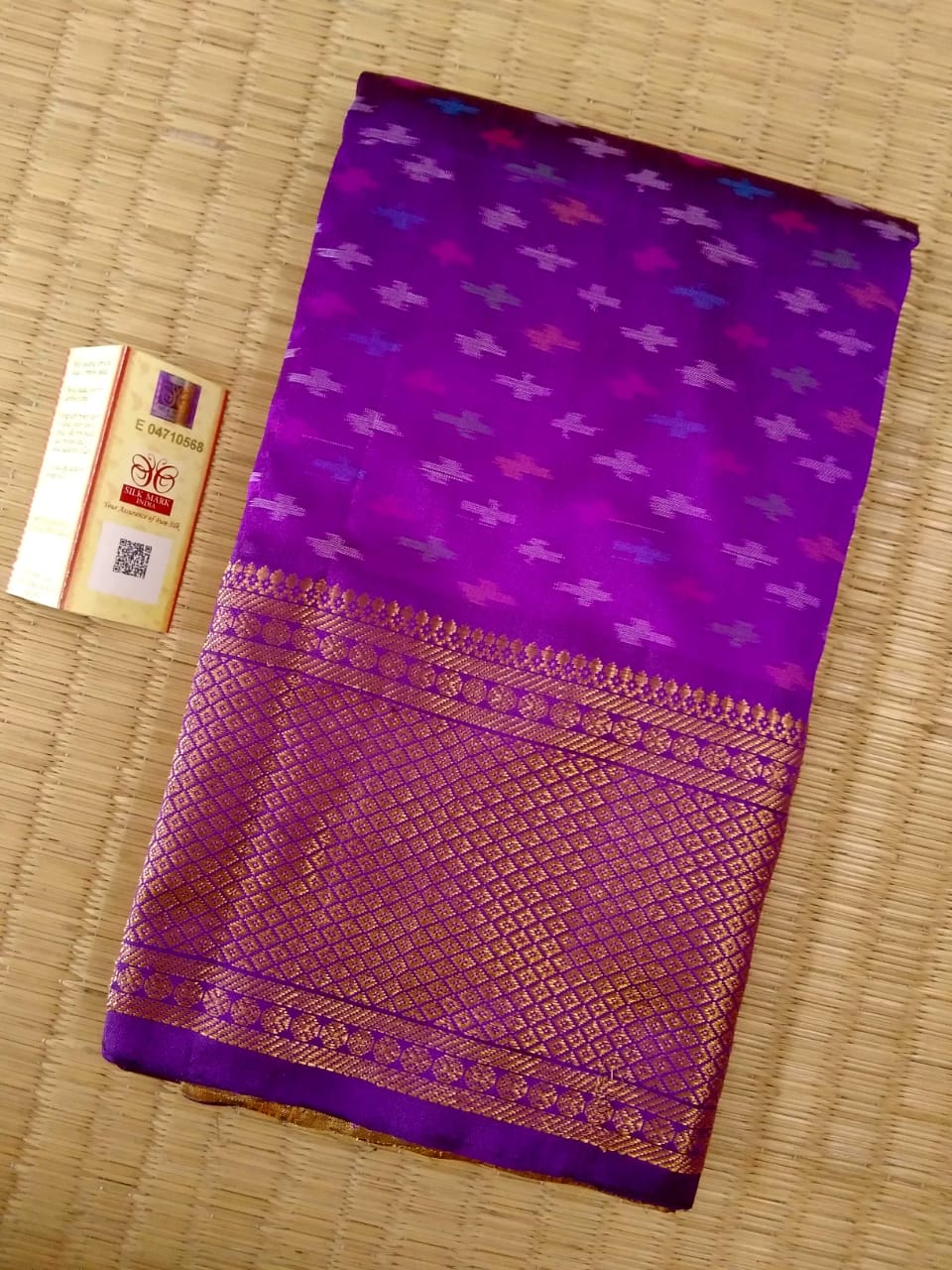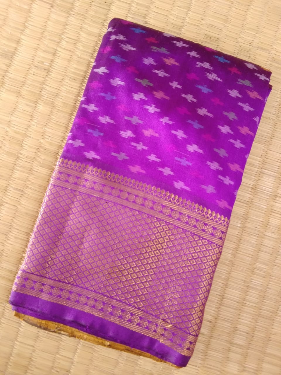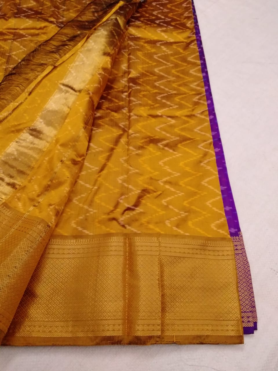 Infuse statement art into your wardrobe with our Her Ikkatness - handloom Ikkat Pure Silk saree with Kanchi border, a fusion of Ikkat Saree body, and Kanchipuram Pattu border. With a vibrant combo of warm and cool color palettes, our versatile saree in Magenta & Mustered colors is an elegant choice for your upcoming festival & special occasions.
